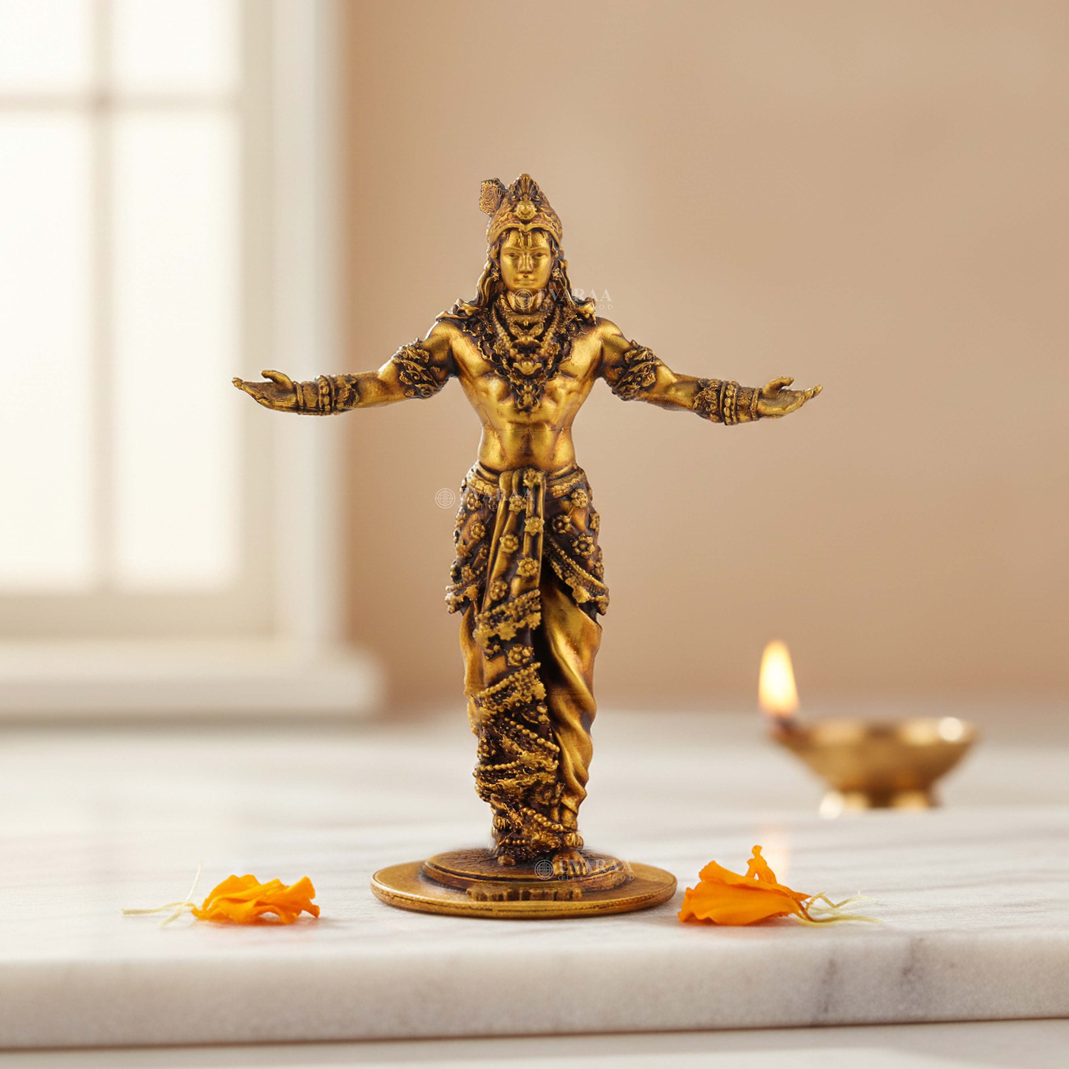 The murti features Krishna and Arjuna seated in their chariot, symbolizing themes commonly associated with the Bhagavad Gita. Shree Krishna idols and Krishna–Arjuna chariot statues are often included in home décor, particularly in mandir spaces or as compact display pieces suitable for various rooms, including car dashboards.