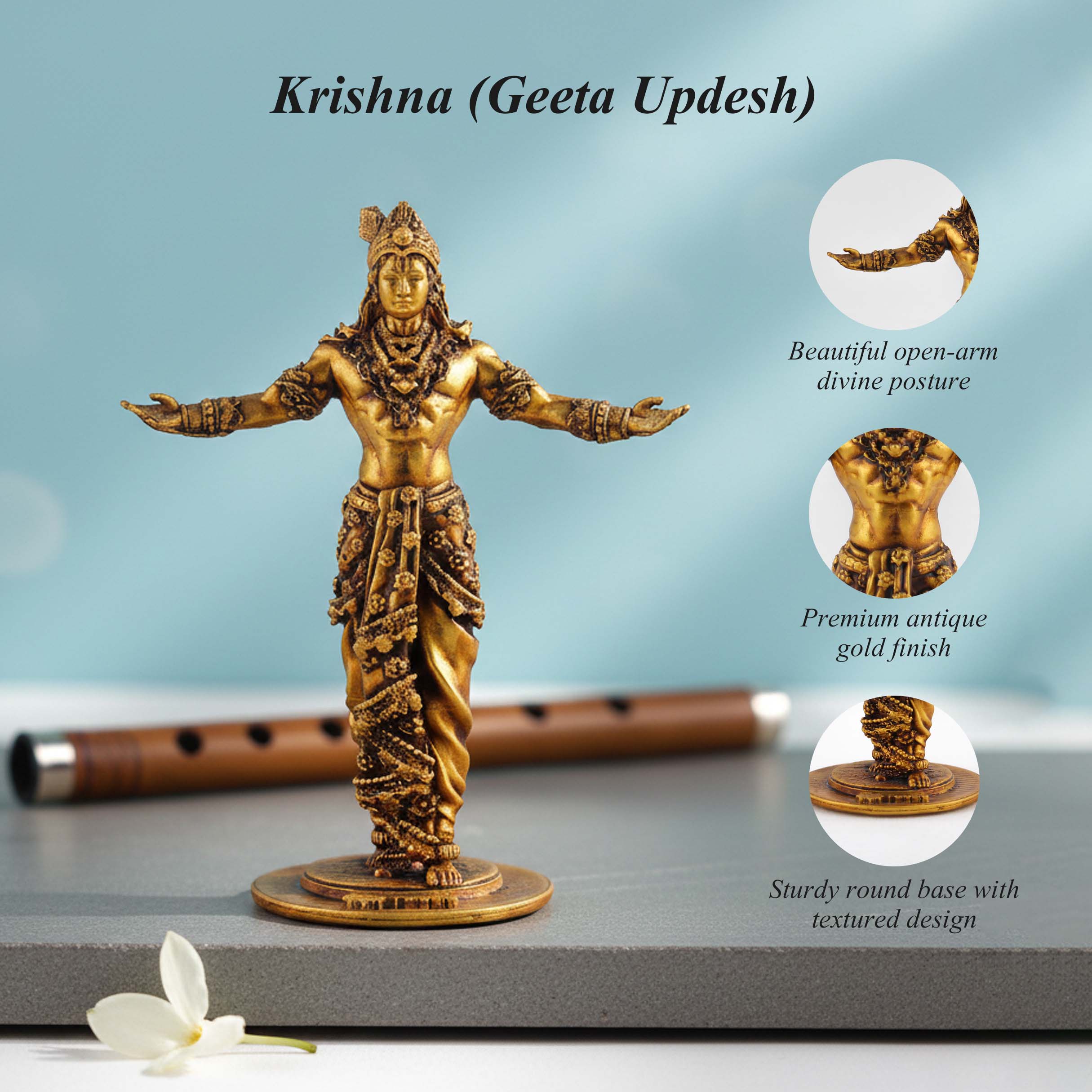 Crafted with attention to classical iconography, the statue highlights detailed elements that are characteristic of traditional depictions of this scene. It serves as a meaningful decorative item inspired by this iconic passage from the Mahabharata.