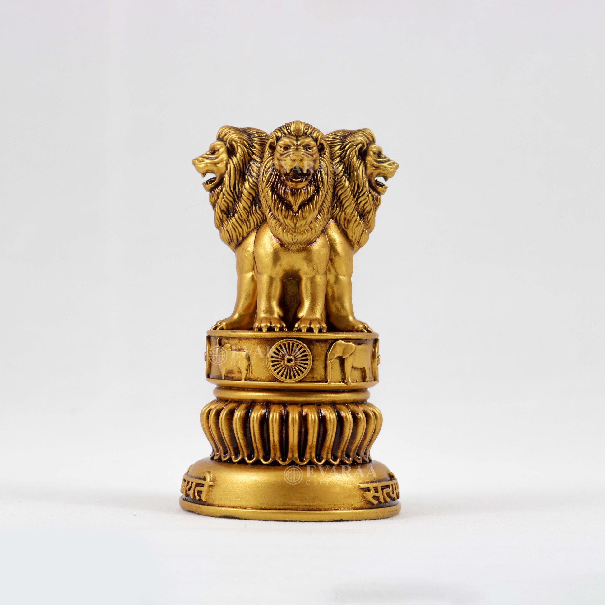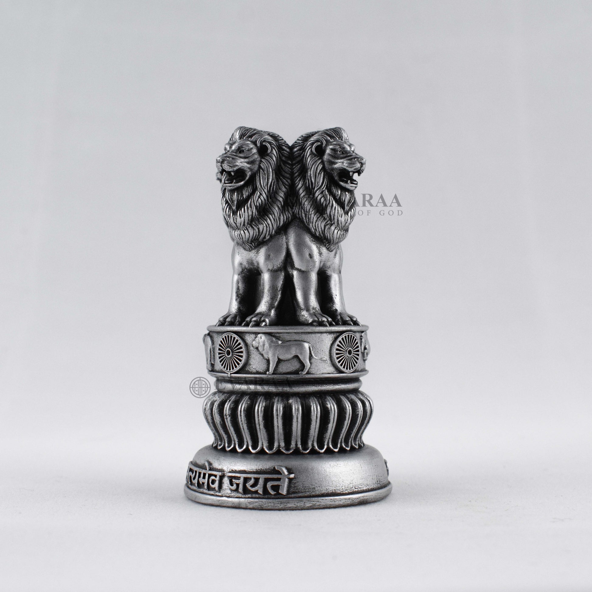 At its crown stand the four majestic lions, positioned back-to-back — representing strength, courage, confidence, and faith . Beneath them rests the beautifully detailed circular lotus base, featuring the revered carvings of a horse, bull, elephant, and the 24-spoke Dharmachakra , the same wheel proudly displayed on the Indian national flag. The pedestal is further adorned with India’s national motto, “Satyameva Jayate” – Truth Alone Triumphs , adding a powerful touch of patriotism.