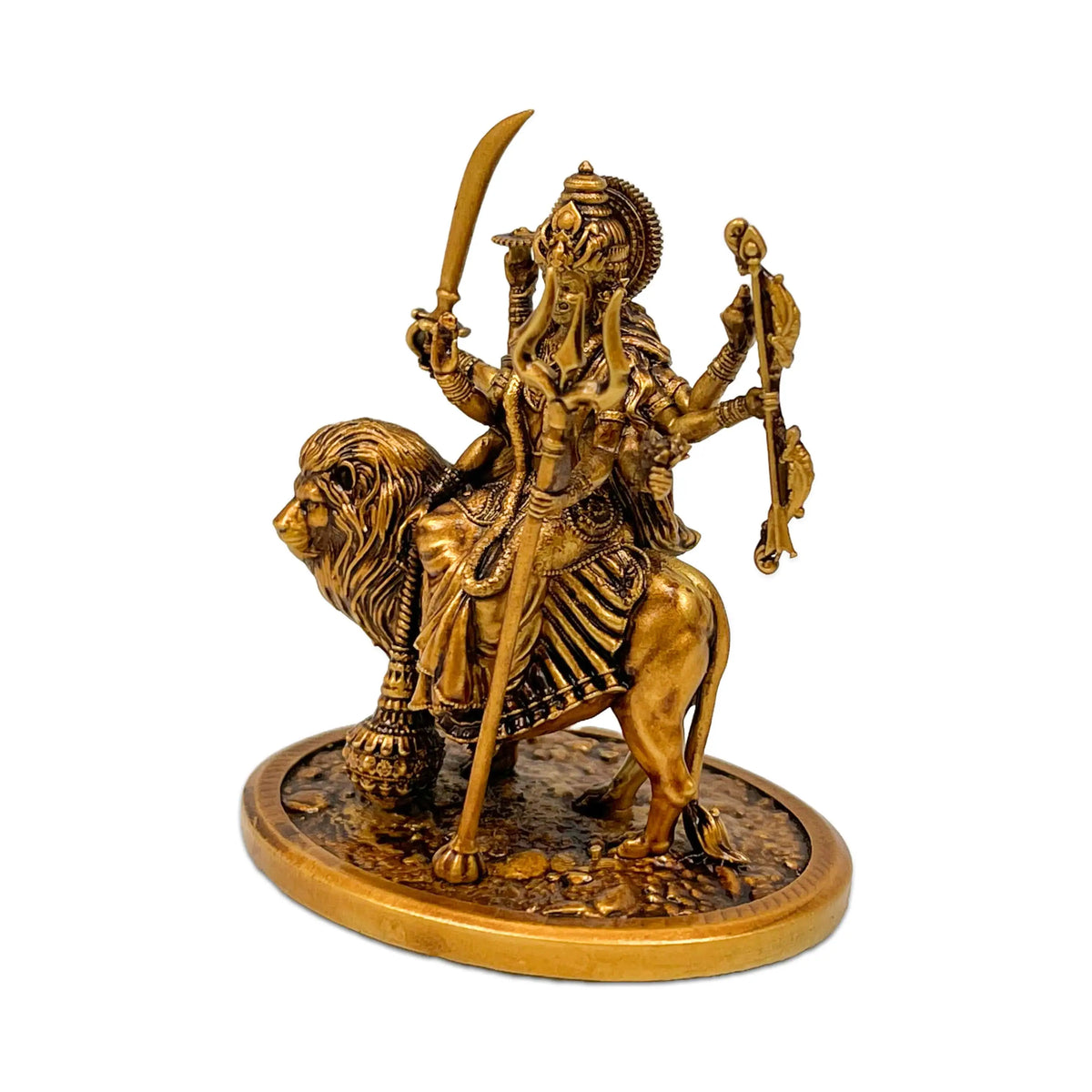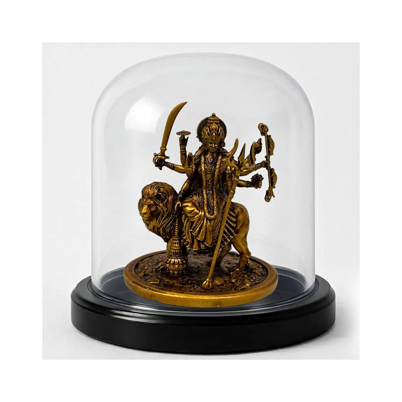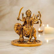 Illuminate your space with the divine presence of Goddess Durga through this beautifully crafted idol. Designed with meticulous attention to detail, the idol captures the Goddess in her powerful multi-armed form, seated upon her majestic lion. Each hand holds a symbolic weapon—trishul, conch, sword, chakra, mace, and bow—reflecting her strength, protection, and unwavering grace.Polished by hand for an elegant finish, this Durga idol brings serenity, courage, and spiritual energy wherever it is placed. Perfect for your car dashboard, study desk, workplace, or as a thoughtful gift, it serves as a timeless reminder of divine power and blessings. Welcome Maa Durga’s sacred presence into your everyday life with this exquisite handcrafted piece.