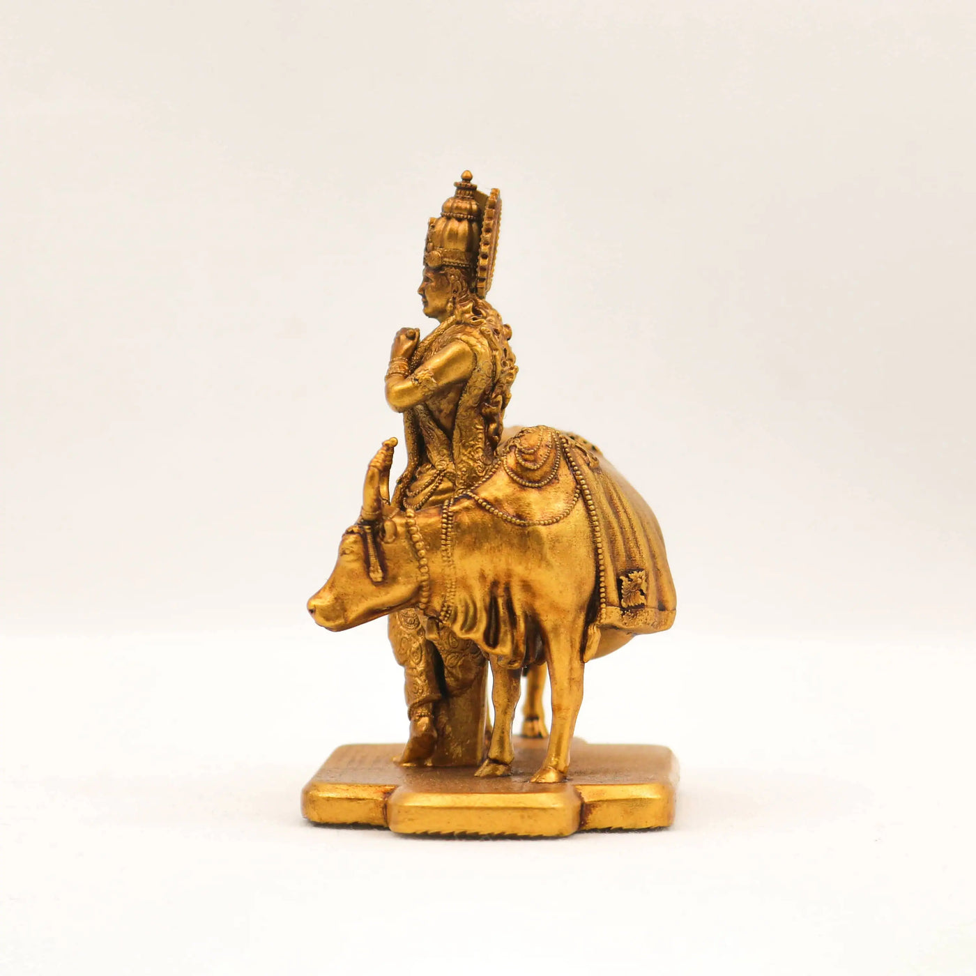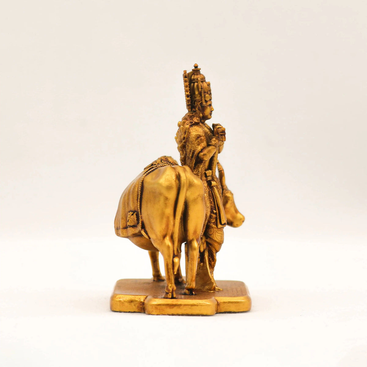 This beautifully handcrafted piece features Lord Krishna in a calm, blissful posture, playing his sacred flute while standing beside a gracefully sculpted cow, symbolizing purity and love. Adorned with a vibrant garland and finished with an exquisite antique touch, the idol elevates the aesthetic of your car’s interior instantly.