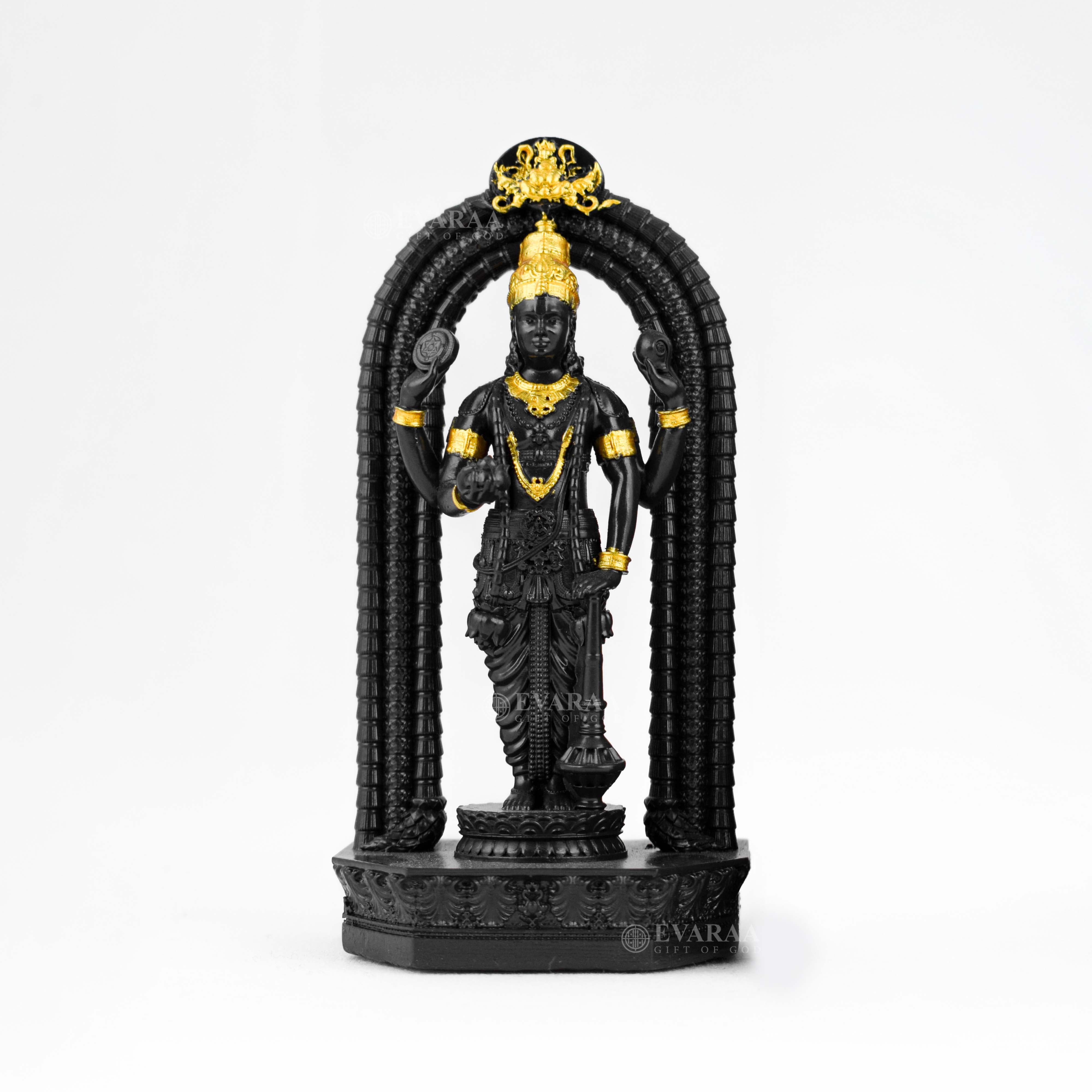 Featuring a graceful standing form of Lord Vishnu under a traditional temple-style arch, the idol showcases intricate detailing with elegant gold highlights on a rich black finish. The compact design makes it perfectly suited for car dashboards, while still maintaining the beauty and sacred essence of traditional temple sculptures.
